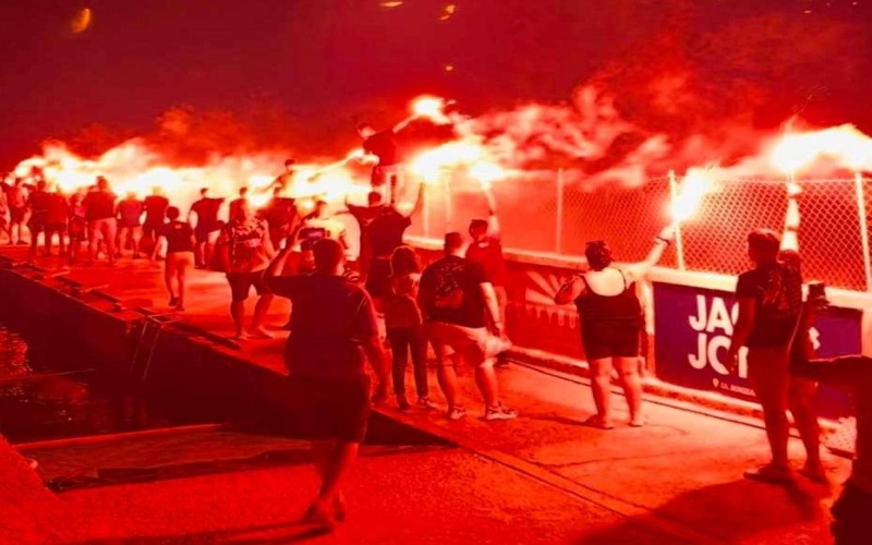 Το τρόπαιο έφθασε με σκάφος στο beach bar που γινόταν η εκδήλωση και η νύχτα έγινε μέρα με πυροτεχνήματα και βεγγαλικά.