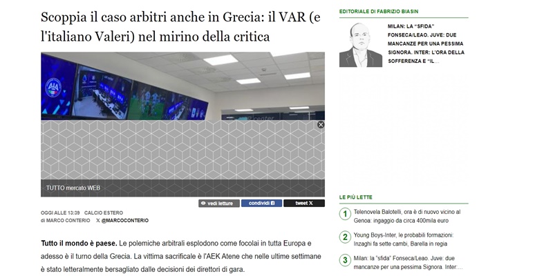 Θέμα στην Ιταλία έγινε η ελληνική διαιτησία και η χρήση του VAR του οποίου τους διαιτητές ορίζει ο επίσης Ιταλός Πάολο Βαλέρι, κάνοντας μια εκτενή αναφορά με τα όσα έχουν συμβεί τις τελευταίες δύο αγωνιστικές κατά της ΑΕΚ στο Αγρίνιο απέναντι στον Παναιτωλικό και έπειτα στη Νέα Φιλαδέλφεια εναντίον του ΠΑΟΚ.