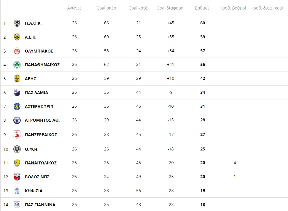 Η βαθμολογία της Super League με την ολοκλήρωση της 26ης αγωνιστικής: