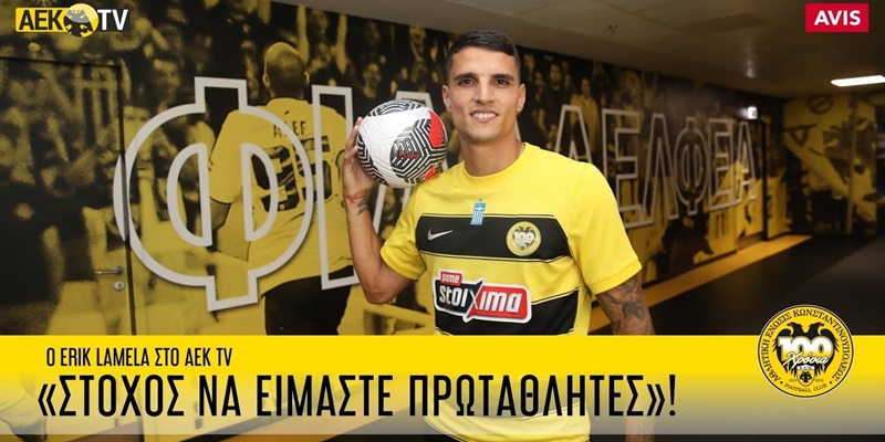 Το νέο τεράστιο μεταγραφικό απόκτημα της ομάδας, Έρικ Λαμέλα, μιλώντας στο ΑΕΚ TV αναφέρει μεταξύ άλλων ότι στόχος είναι να είμαστε πρωταθλητές, ανυπομονεί για το πρώτο του παιχνίδι, ευχαριστεί τον Ματίας Αλμέιδα και αγκαλιάζει θερμά τον νέο ιδιοκτήτη της ΠΑΕ ΑΕΚ, Μάριο Ηλιόπουλο που τον υποδέχεται στο νέο του σπίτι.